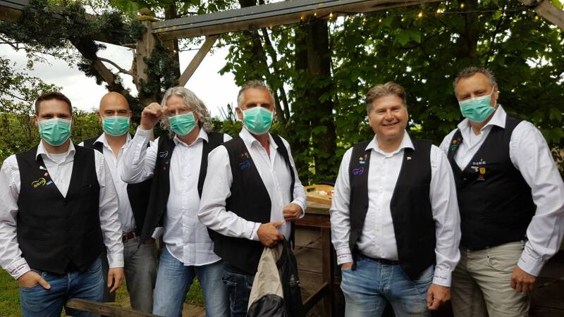 Foto 2018; na een fikse griep van heer Roland, dachten de heeren dat het grappig zou zijn om voorafgaand aan de bijeenkomst met een mondkapje te verschijnen. We wisten destijds niet dat het een voorspellende waarde zou hebben....