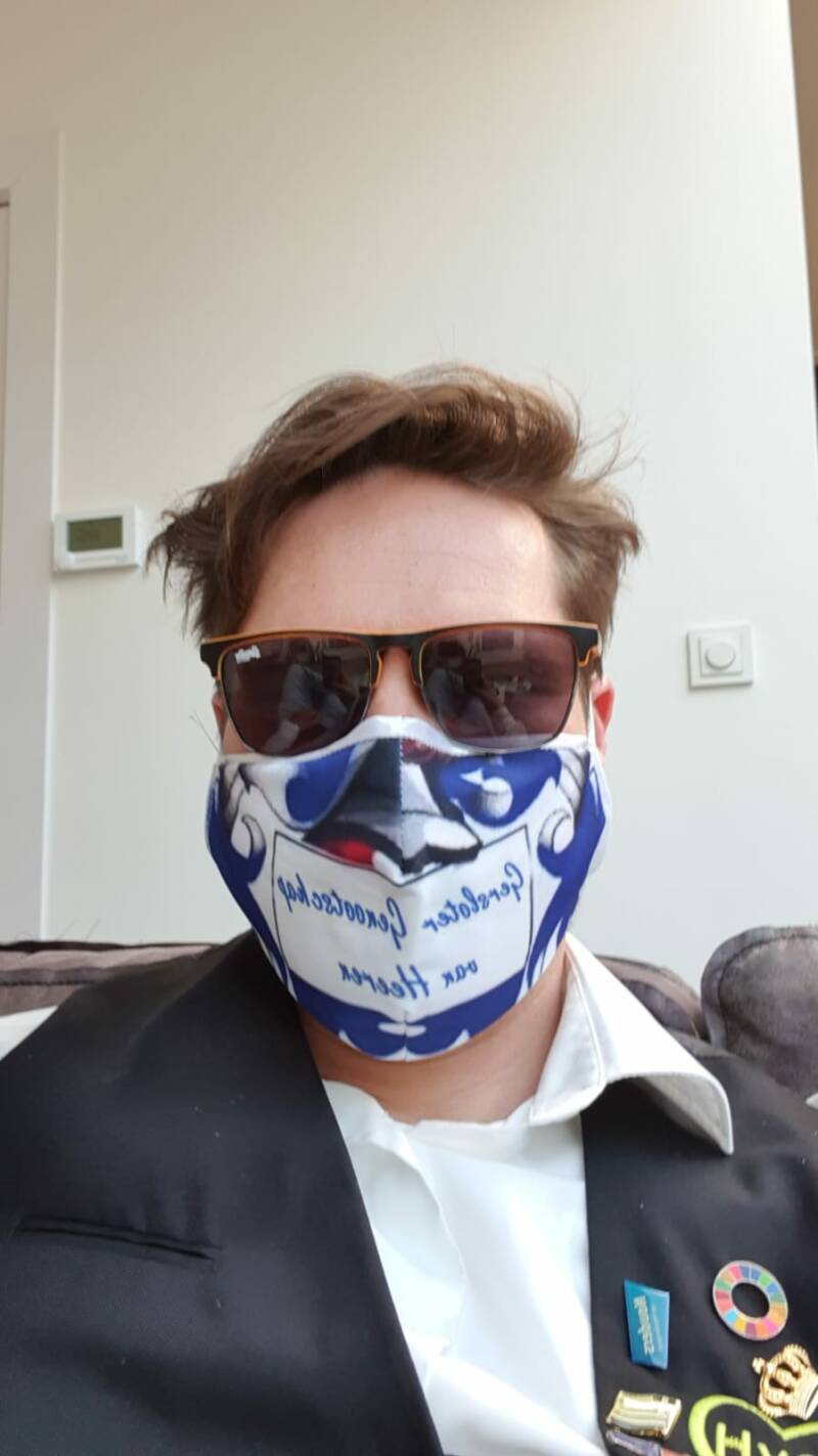 Onder het motto Kappen nou! doet de mondkapjesplicht ook bij het GGvH zijn intrede. heer Niels laat hier zien dat de modieuze van zuiver katoen gemaakte GGvH mondkap ook nog eens zeer praktisch voor brildragers is.