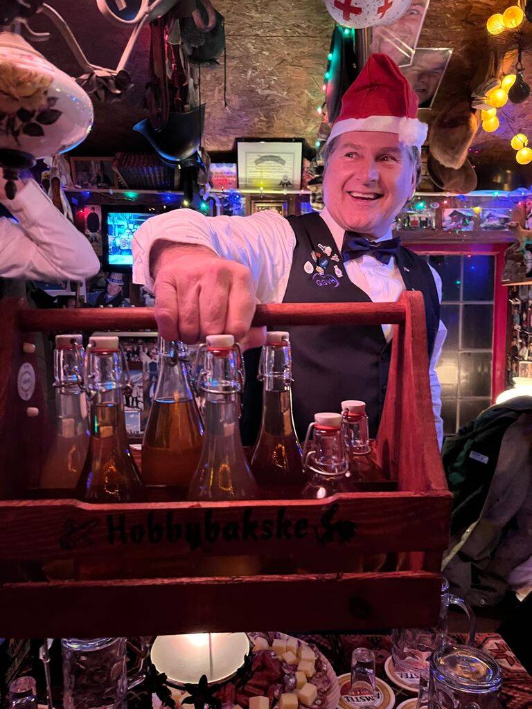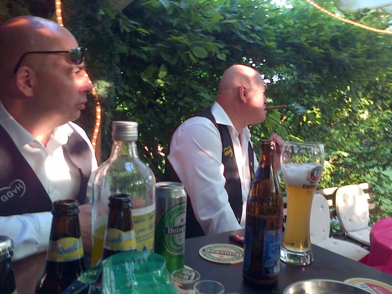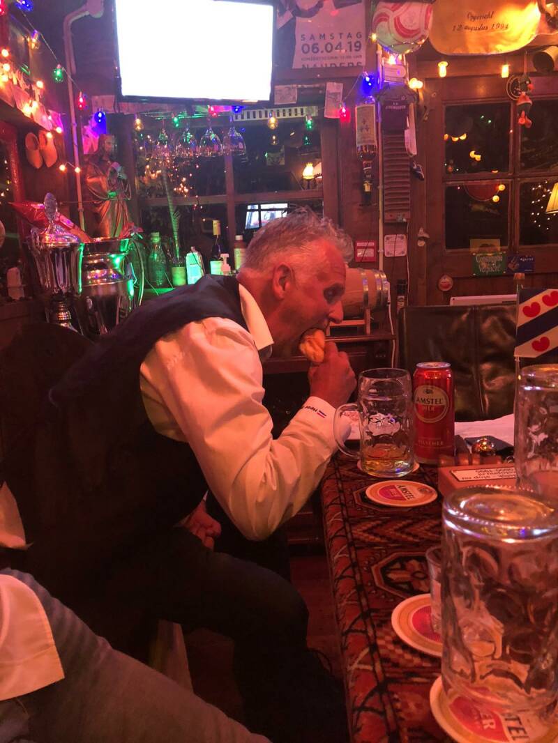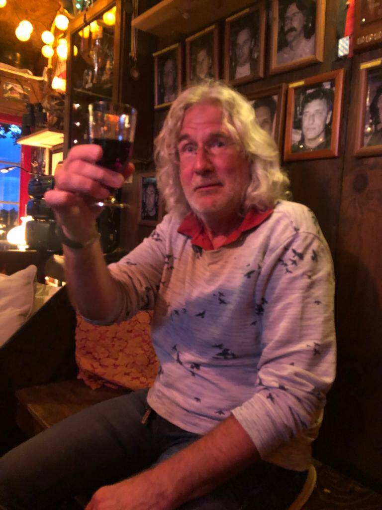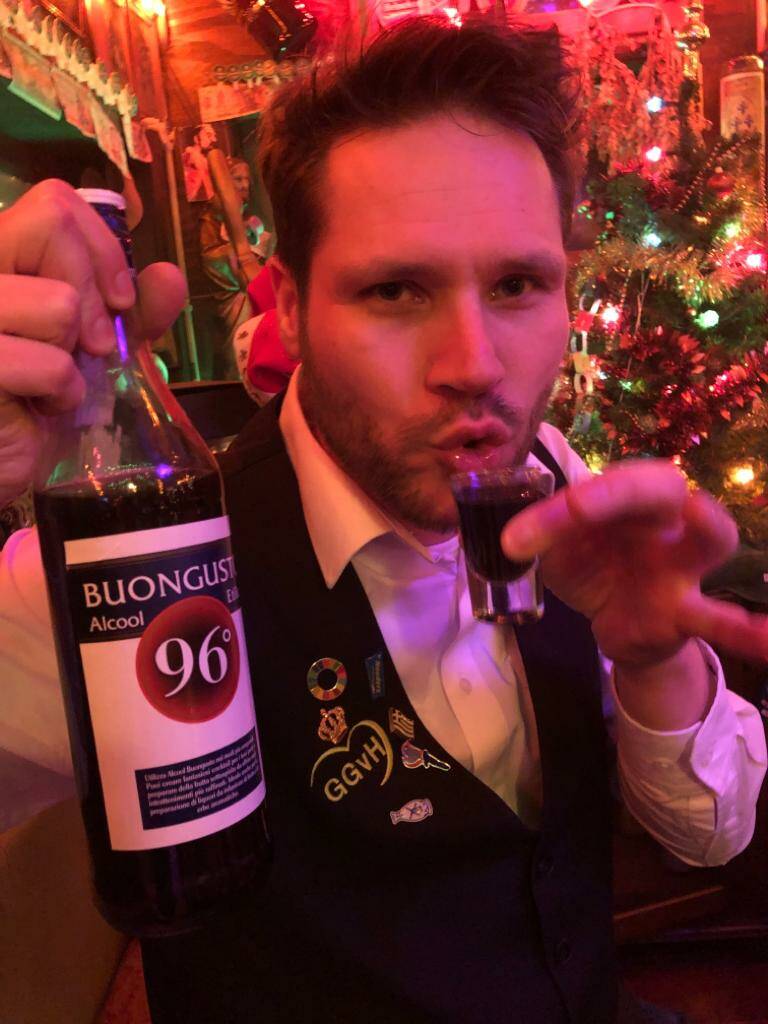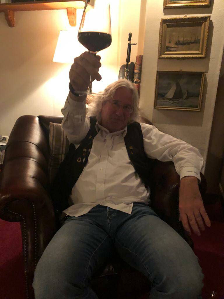 heer Niels geniet hier van een Dropshot van bottelaar heer Sicco. Uitsluitend voor grofproevers met stalen slokdarm. De vloeibare versnapering kent een stevige afdronk en heeft een sterke uiterlijke gelijkenis met afgewerkte olie....