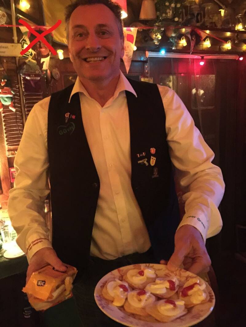 heer Pieter presenteert de zogeheten retro-hapjes. Snacks uit vervlogen tijden. In casu TUC biscuits met gekookt ei mayonaise en toefje ketchup. Ook de Sint Nicolaas versiering komt uit vroegere jaren en is vanzelfsprekend aan de 21e eeuwse maatstaven aangepast....