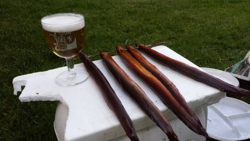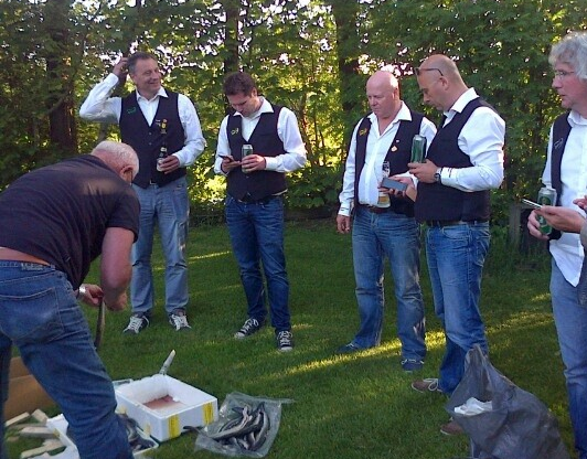 Kampioensfeest 2014 Ielrikje, Peter van der Waard preases van de inmiddels opgeheven zusterorganisatie het Wirdumer Genootschap van Heeren voorziet het GGvH van versgerookte paling.